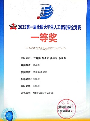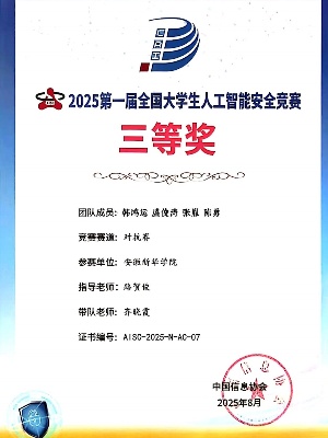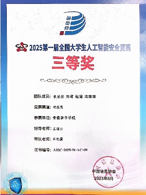 在首届全国大学生人工智能安全竞赛中,太阳集团电子游戏学子同样表现优异。该竞赛由中国信息协会主办,吸引来自全国88所高校的350支队伍参与。经过激烈比拼,由齐晓霞老师指导,万锦鹏、何俊辰、盛德军、秦淮志组成的团队荣获对抗赛赛道全国一等奖;由路贺俊老师指导的学生团队以及由王迎云老师指导的学生团队,分别获得该赛道全国三等奖。